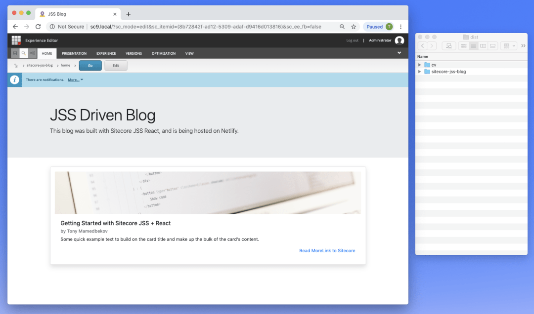 After a successful deployment, you should see the site load in the Experience Editor, as well as you should have your bundle located in the ‘dist’ folder.
